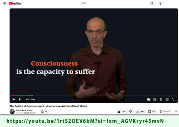 『サピエンス全史』のユヴァル・ノア・ハラリは、「意識とは苦痛を感じられる能力のことだ」と言っています。人工知能がどれほど完璧な回答を繰り返しても、AIが苦痛を感じられないかぎり、ただのアルゴリズムにすぎないというわけです。